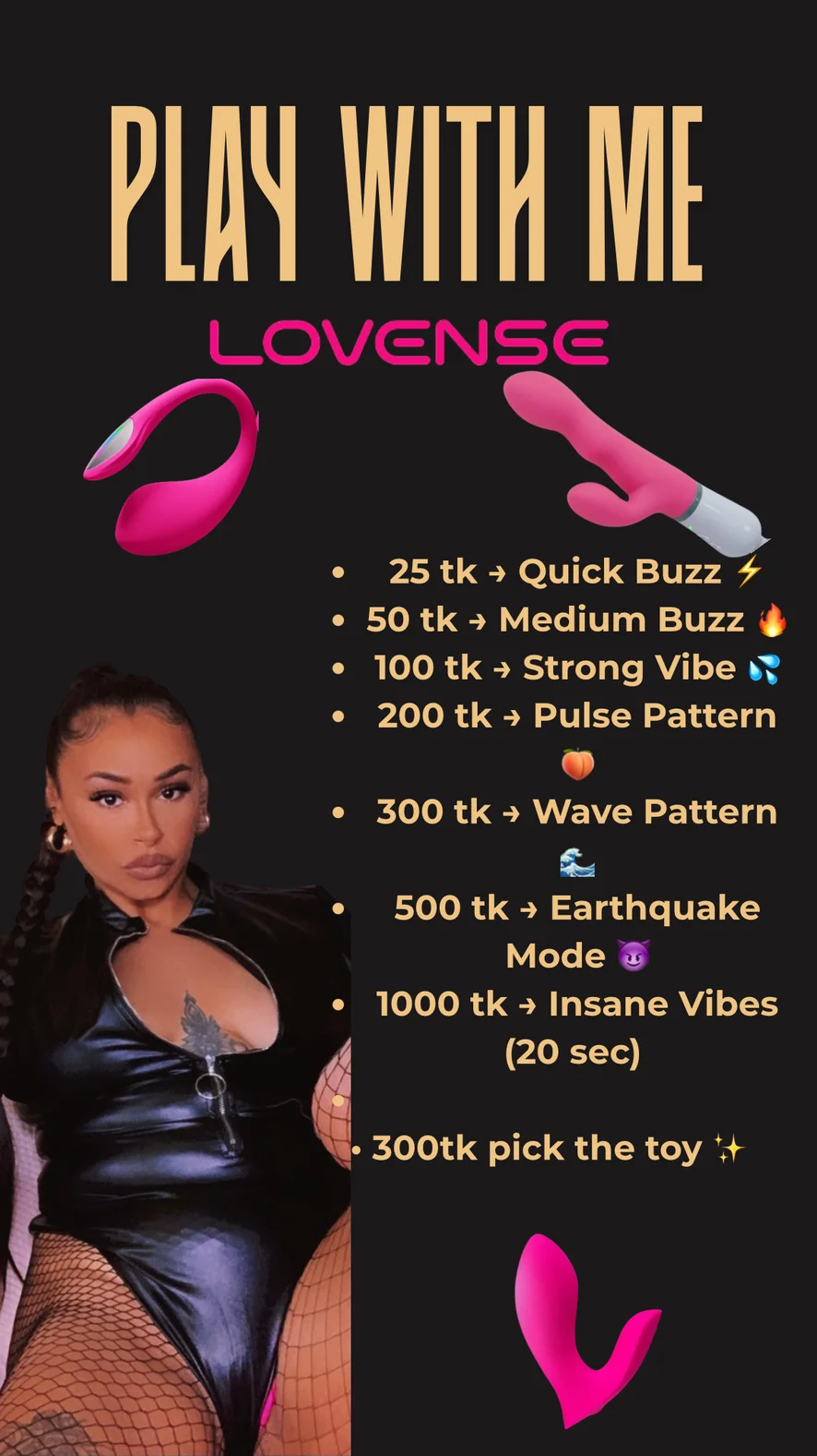 تقييم الزبر, تدخين, صدر عارٍ, تحت التنورة, صفع, كعوب عالية, فتيشية القدم, مص, قضيب صناعي أو هزاز, وضعية الكلب, تصبيع, إهانة, تعليمات الاستمناء, العادة السرية, عرض زيت, ألعاب جنسية, حلق عميق, كلام بذئ, تعري, بلع حتى الرغبة في القيء, نشوة, لعب الأدوار, قضيب يُرتدى, رقص التعري