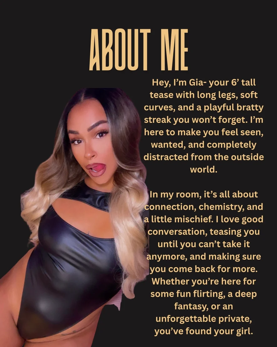 I know how to tease, tempt, and keep you hooked until you can’t get enough. At 6 feet tall, I’m impossible to ignore a mix of natural beauty, playful energy, and experience that knows exactly how to please.